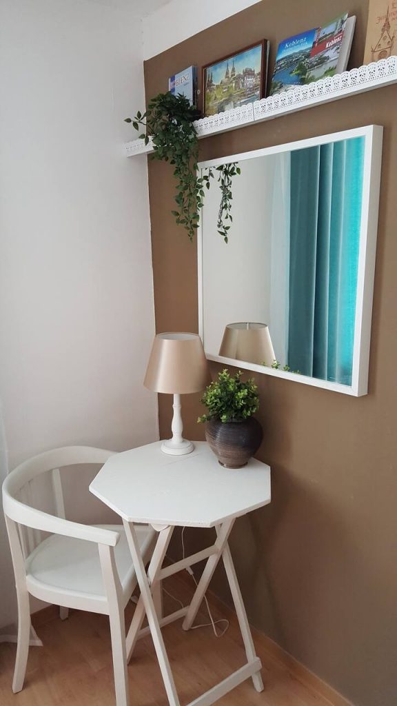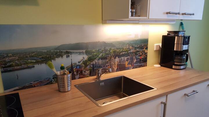 Einkaufsmöglichkeiten, aber auch Restaurants und Kneipen sind in unmittelbarer Nähe. Bis zur Mosel sind es ca. 200 Meter, bis zum Deutschen Eck ca. 500 Meter. Es gibt einen großen Flatscreen TV und natürlich WLAN. Einbauküche mit Mikrowelle, Induktionskochfeld und Geschirrspüler.