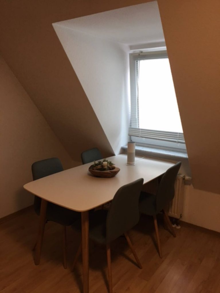 Über einen kleinen Flur gelangt ihr in die große und gemütliche Wohnküche und in das Wohnzimmer – dort gibt es noch eine weitere Essecke. Die Einbauküche hat einen Kühlschrank mit Gefrierfach, eine Mikrowellen/Ofenkombination (Heißluft + Grill), ein Induktionskochfeld (Glaskeramik), ein großes Spülbecken und natürlich eine Geschirrspülmaschine. Für den morgendlichen Kaffeegenuss steht eine Kaffeemaschine mit Mahlwerk für ganze Bohnen zur Verfügung – sehr praktisch: eine tolle Kaffeerösterei gleich im Nachbarhaus. Natürlich gibt es auch Toaster, Wasserkocher, Eierkocher und auch einen Reiskocher.